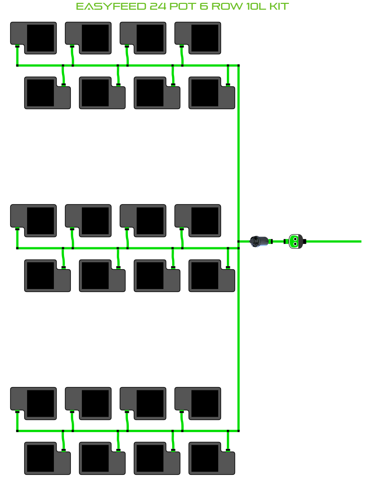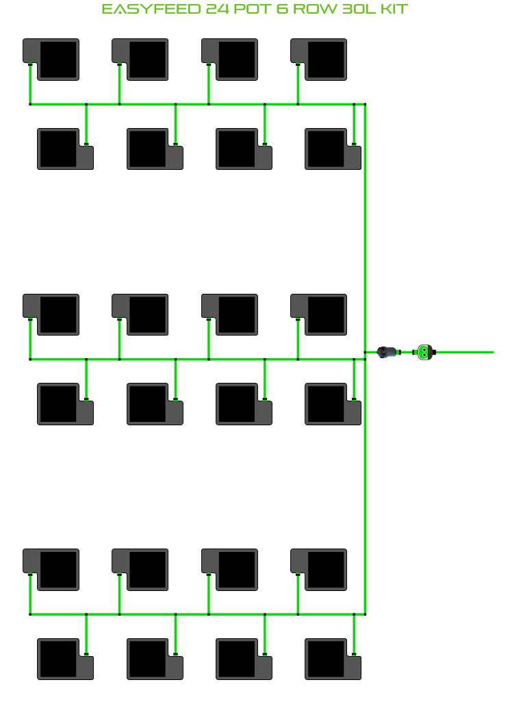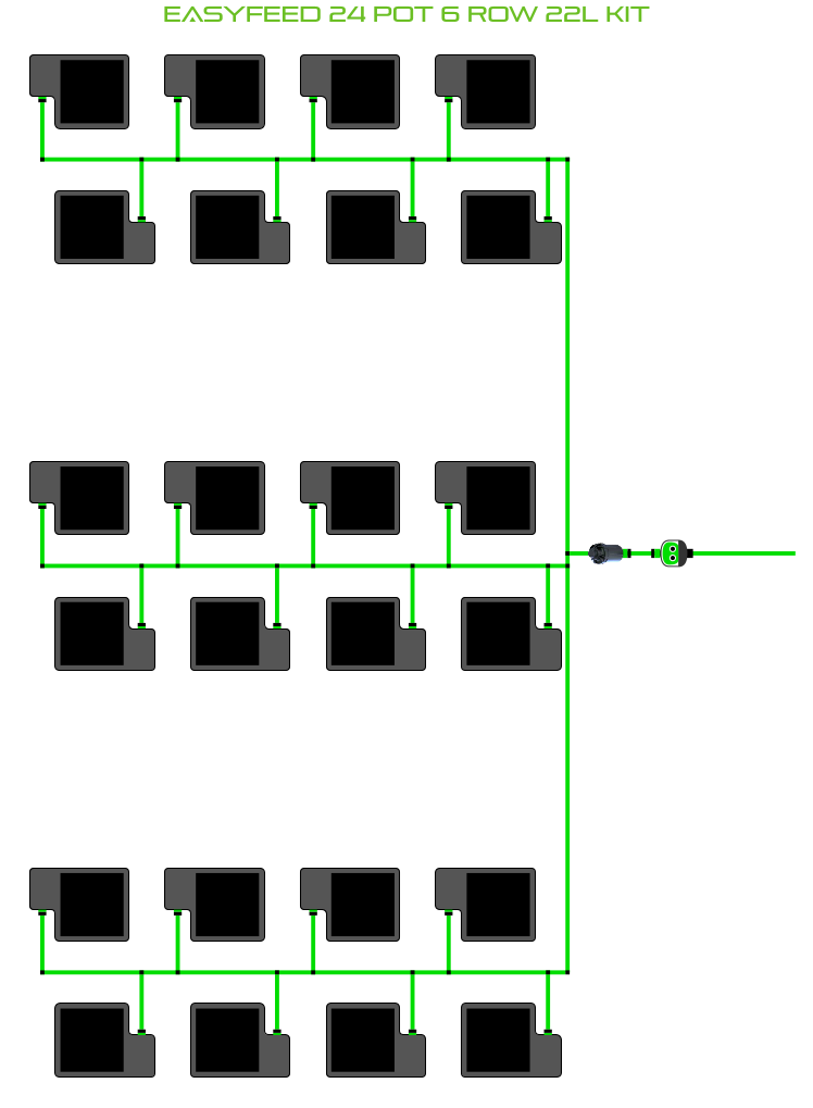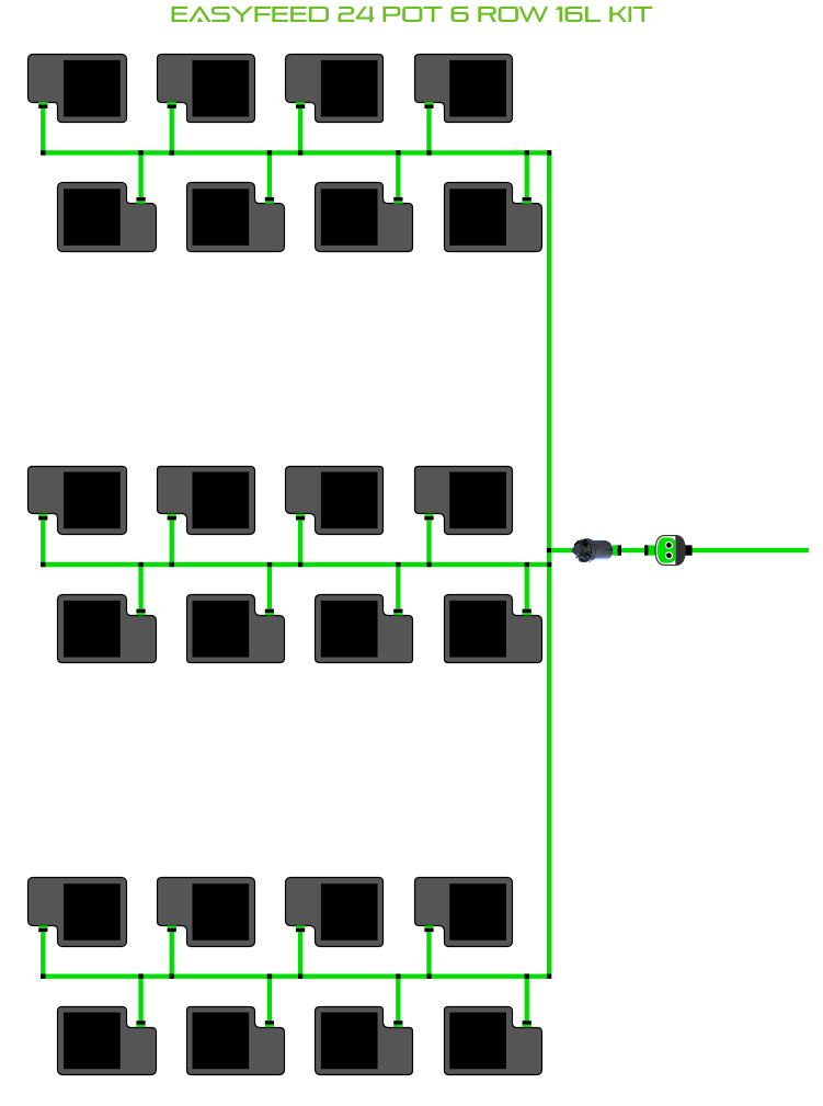 The ALIEN EasyFeed 24 Pot 6 Row Kit is available in 4 pot sizes. Easy to configure and assemble with advanced features and setup options including the ability to create an aisle in the middle of rows for complete plant access, grow 24 plants to perfection while bottom-feeding with scheduled dry-backs with this ALIEN EasyFeed Kit!