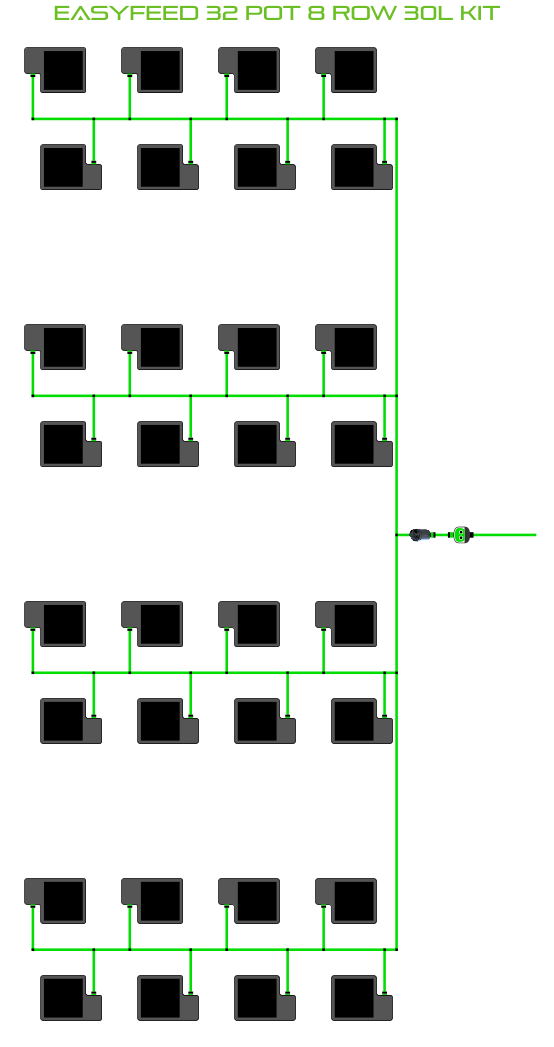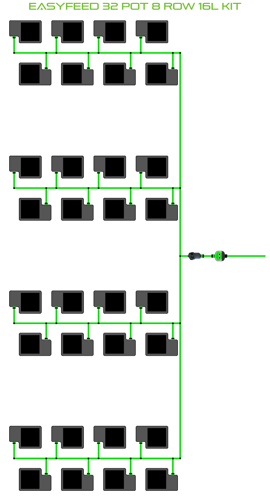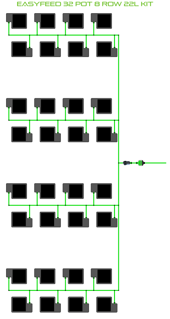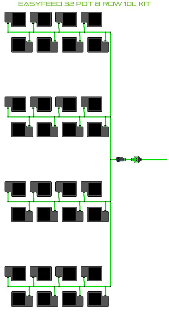The ALIEN EasyFeed 32 Pot 8 Row Kit is available in 4 pot sizes. Easy to configure and assemble with advanced features and setup options including the ability to create an aisle in the middle of rows for complete plant access, grow 32 plants to perfection while bottom-feeding with scheduled dry-backs with this ALIEN EasyFeed Kit!
