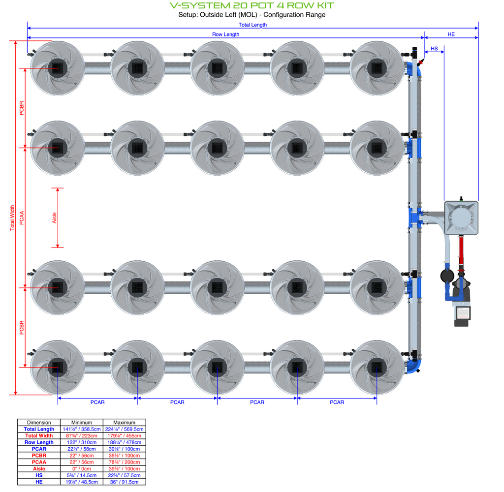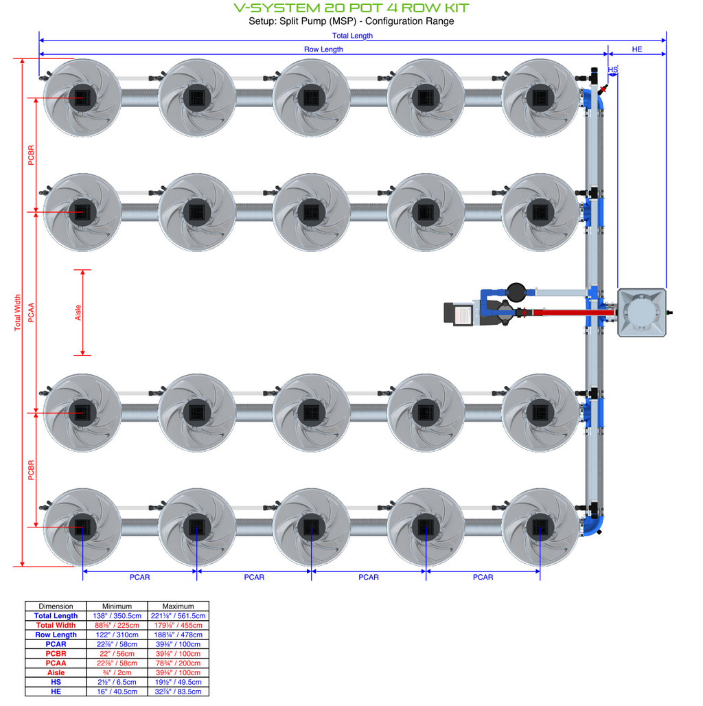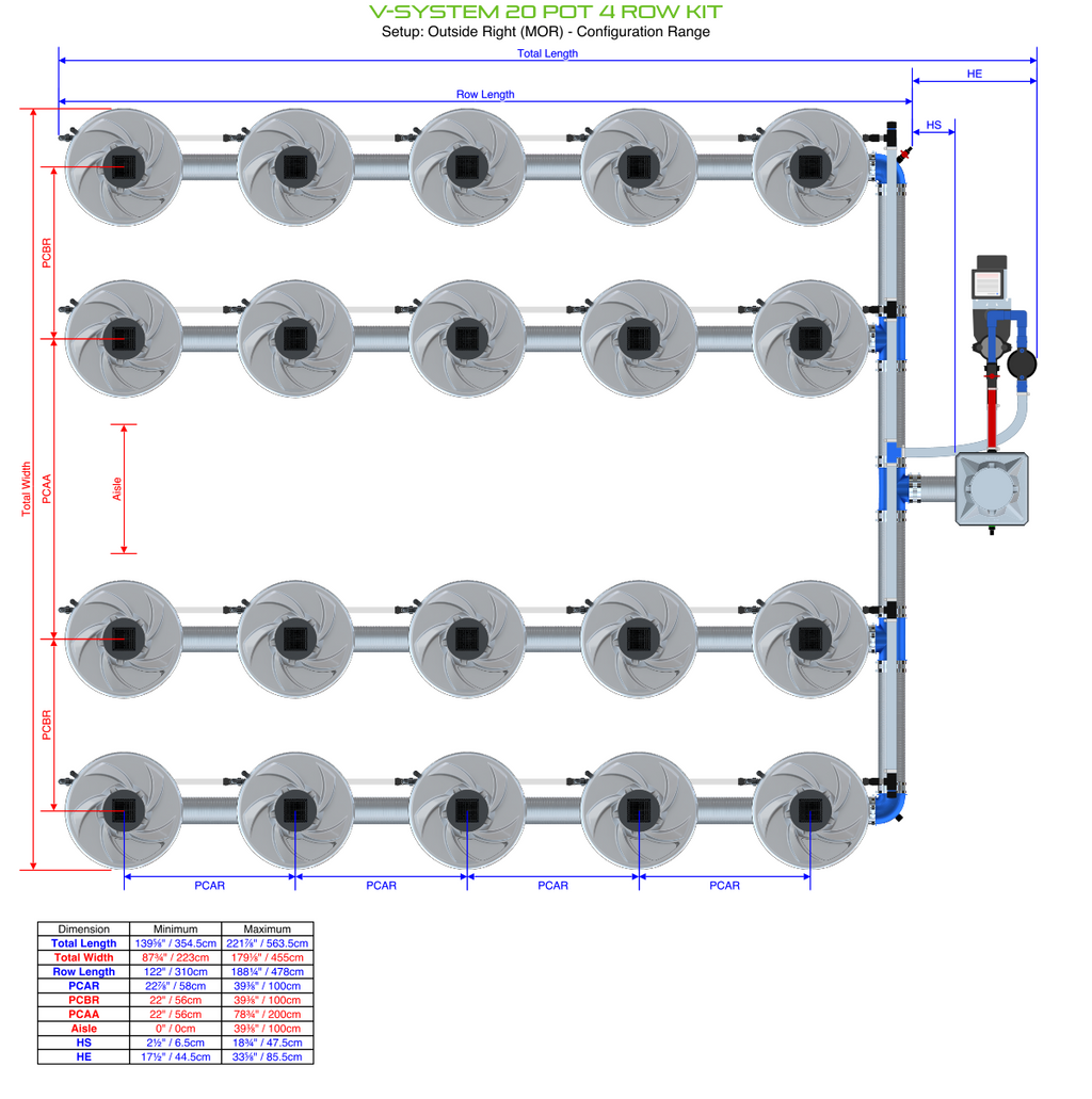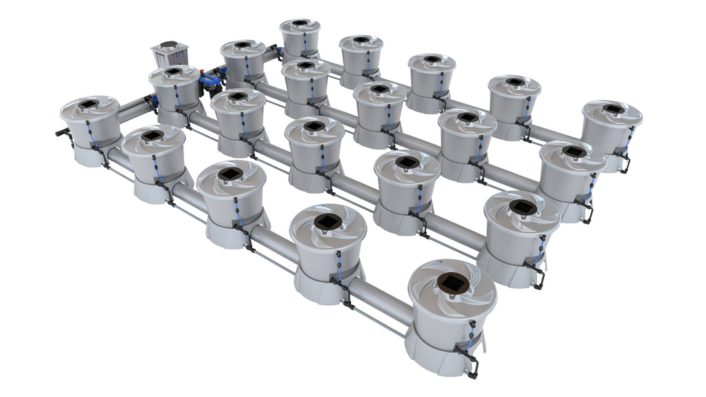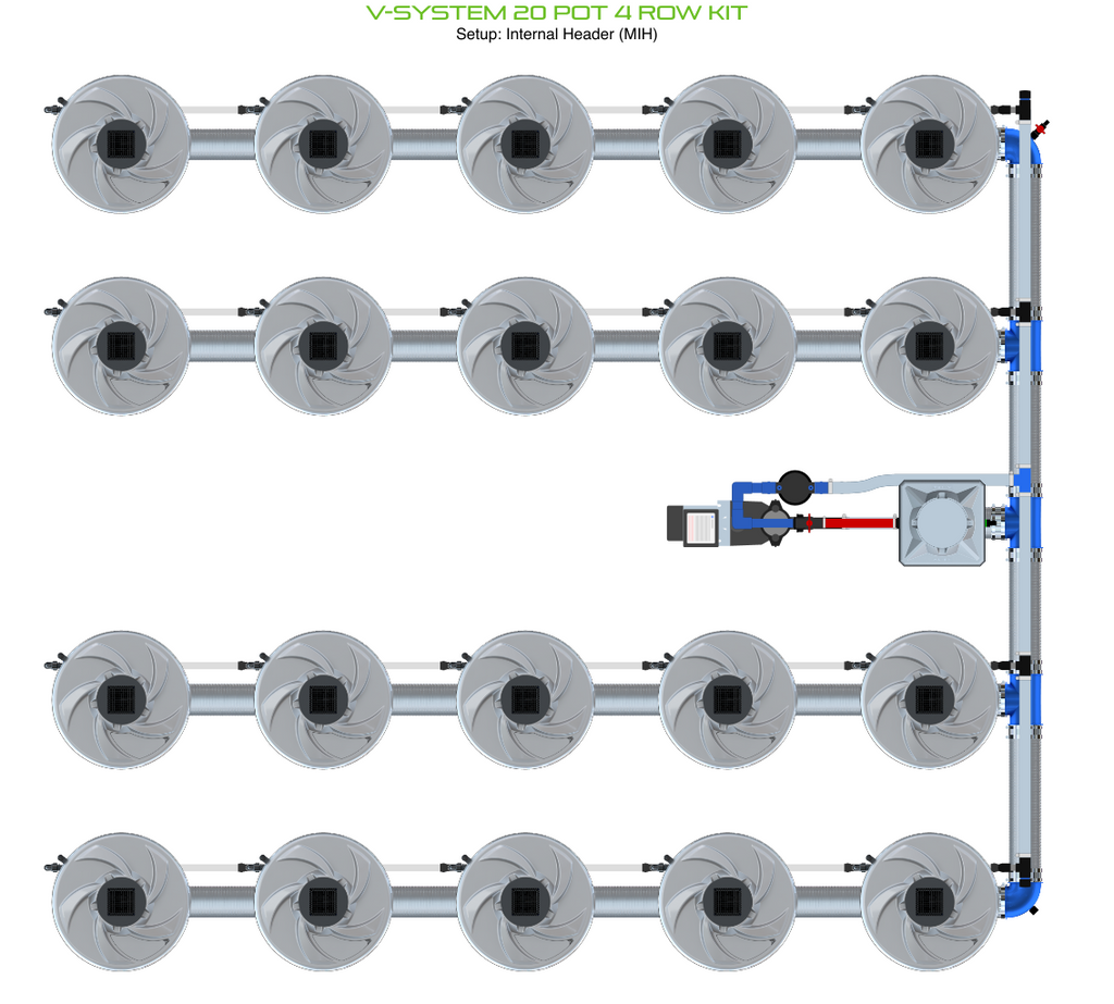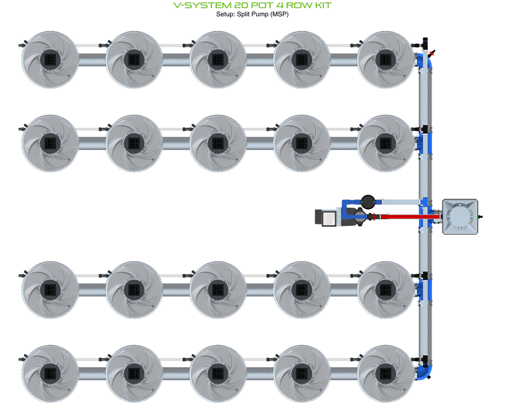 The ALIEN V-SYSTEM 20 Pot 4 Row Kit has 4 layout options for header and pump placement to best fit your grow area. The header and pump can be placed outside a grow tent / room, or made as compact as possible. Easy to configure and assemble with advanced features and setup options including the ability to create an aisle in the middle of rows for complete plant access, grow 20 plants to perfection in the ultimate recirculating deep water culture with this ALIEN V-SYSTEM Kit!