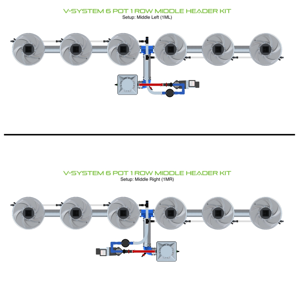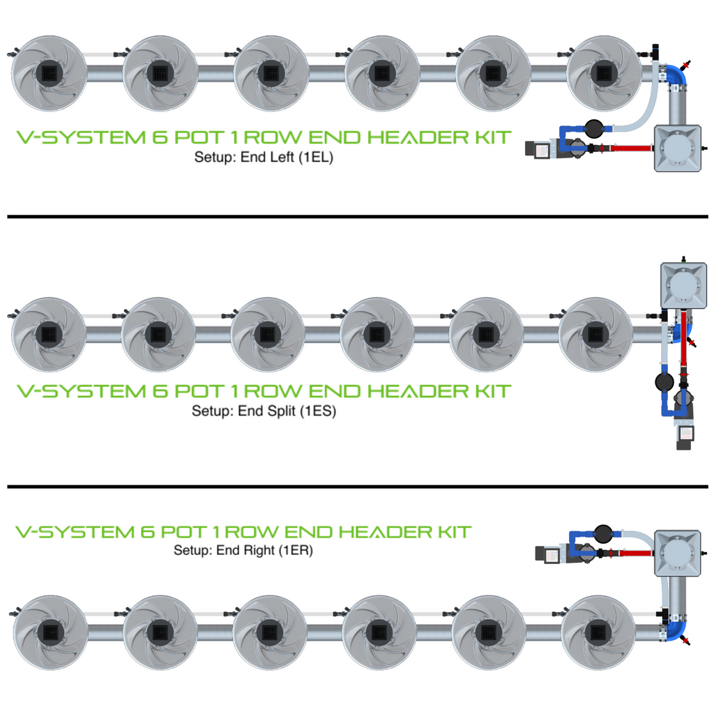 The ALIEN V-SYSTEM 6 Pot 1 Row Kit is available in two different versions, with the header either at the end of the row or in the middle. For end header kits, there are 3 layout options for header and pump placement relative to the row of pots, and 2 layout options for middle header kits. The header and pump can be placed outside a grow tent / room, or made as compact as possible. Easy to configure and assemble with advanced features and setup options, grow 6 plants to perfection in the ultimate recirculating deep water culture with this ALIEN V-SYSTEM Kit!